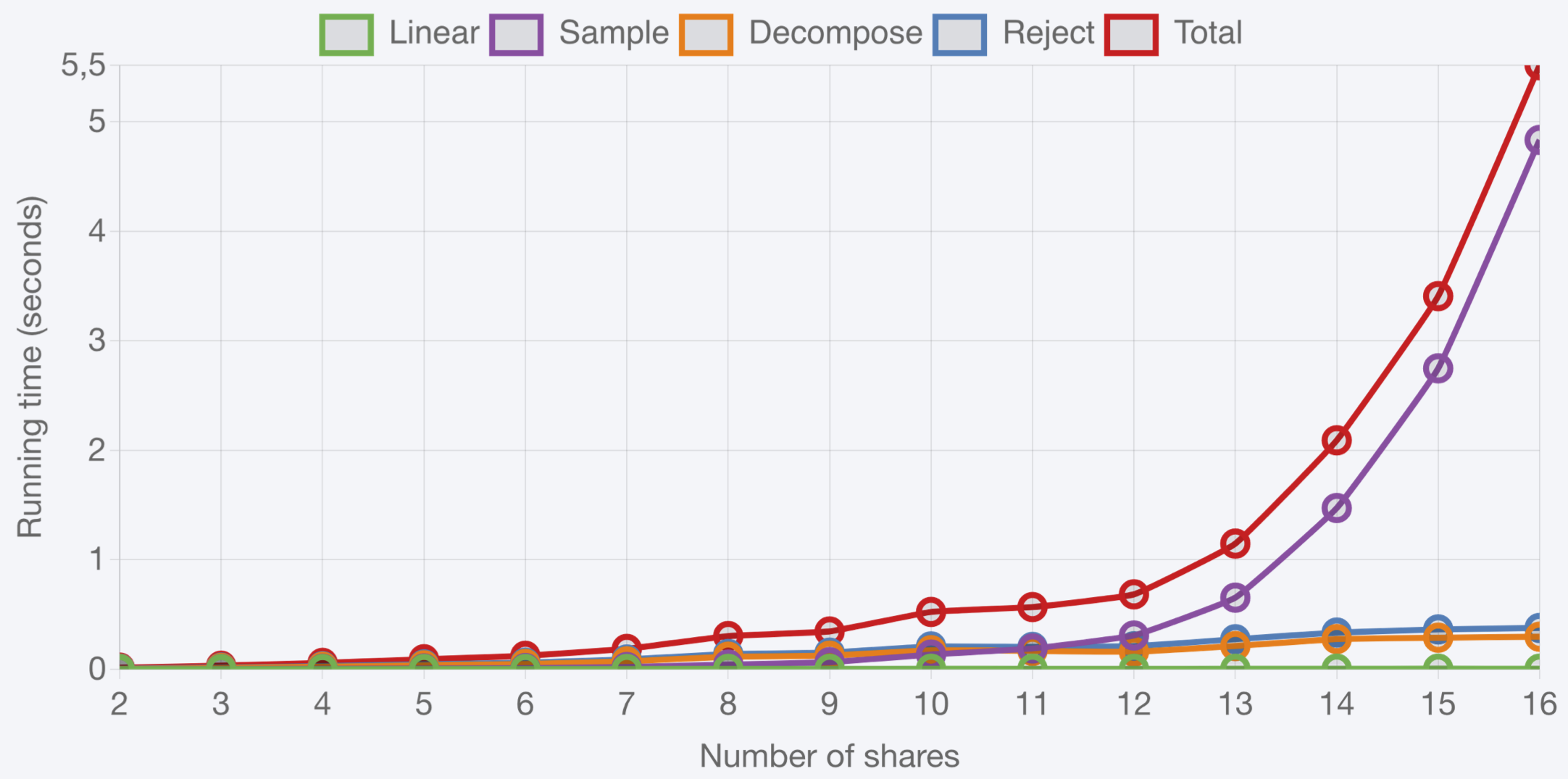 Unfortunately, there does not seem to be an easy way to compute [Decompose] in arithmetic masked form efficiently. As of today, the best known approach is to switch from arithmetic to Boolean masking using a mask conversion, then perform [Decompose] in this representation. The Steps 1 [Sample] and 6 [Reject] suffer from similar issues. Simply put, there is no known way to mask Dilithium without using expensive mask conversions. The blow-up in running time when masking Dilithium makes it unrealistic to reach high masking orders, as illustrated below using an open source implementation (GitHub) from a recent paper by researchers at IDEMIA and Université du Luxembourg (TCHES). These numbers were obtained on a desktop with Intel Core i7 7700T @ 2.9 GHz. We can see in these graphs that [Decompose], [Reject] and especially [Sample] make up most of the cost of masked Dilithium.