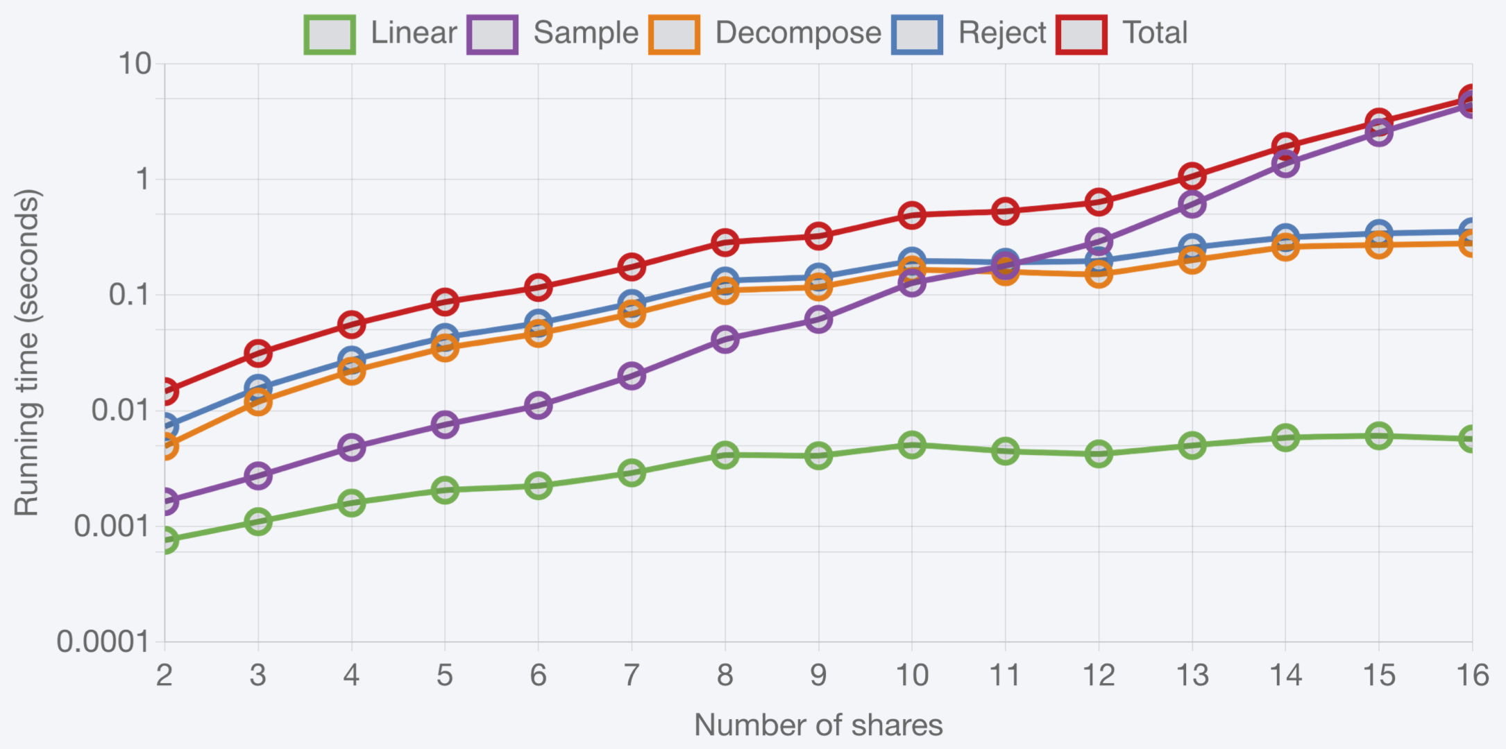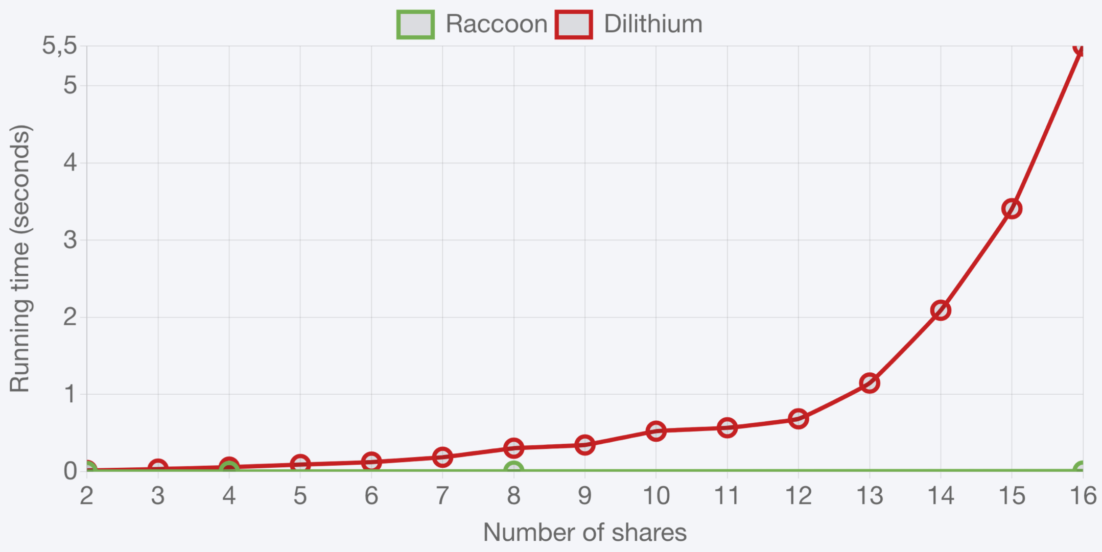While we got the skeleton of a scheme, we needed to turn this into a polished scheme. Fortunately for us, we had many colleagues at PQShield who excelled at what we needed: Markku is is highly skilled in highly efficient and secure embedded implementations, Shu and Mary are experts in security proofs, Thomas Espitau is savvy in lattice cryptanalysis and parameter selection, and Fabrice (now at XWIKI) has a good transverse understanding of all these aspects. Outside PQShield, we enlisted the help of Mélissa Rossi (ANSSI), an expert in security proofs for masking schemes. By combining the skills and ideas of this team of great people, we submitted to the NIST PQC call for additional signatures a scheme, Raccoon, that can be masked at high orders with minimal overhead, and orders of magnitude faster than Dilithium, as illustrated in this final figure: even with 8 shares, our unoptimized implementation of masked Raccoon is already 50 times faster than the optimized implementation of masked Dilithium.